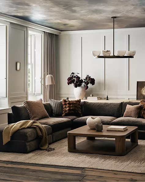 LIVING ROOM DRAMA Sunlight pours across the Park Avenue Sectional Sofa, highlighting its plush cushions and perfectly tailored lines. Surround it with Down-Blend Throw Pillows in soft, layered tones, and suddenly the room feels curated and intentional. A Marble & Brass Accent Table anchors the space with elegance, while subtle textures and finishes elevate every corner into a scene worthy of a magazine spread.